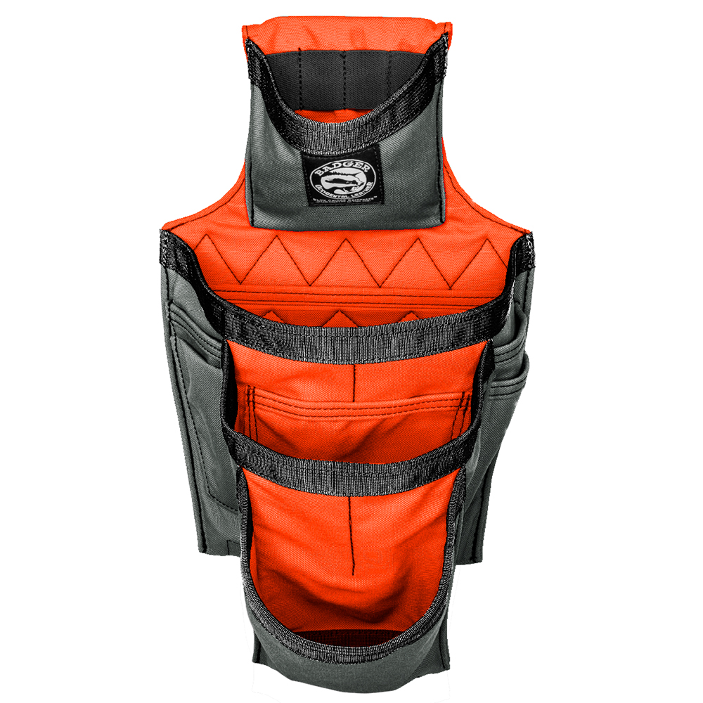 Framer Fastener Bag: Tape pouch with 4 interior 1″ wide elastic slots, speed square slot in main pouch with wide tool slot below, fastener pouch with slot, lower fastener pouch, two front tool pockets, 2 stacked rear tool slots and a reinforced bar sleeve on the underside of the bag. Overall length is approximately 17″.