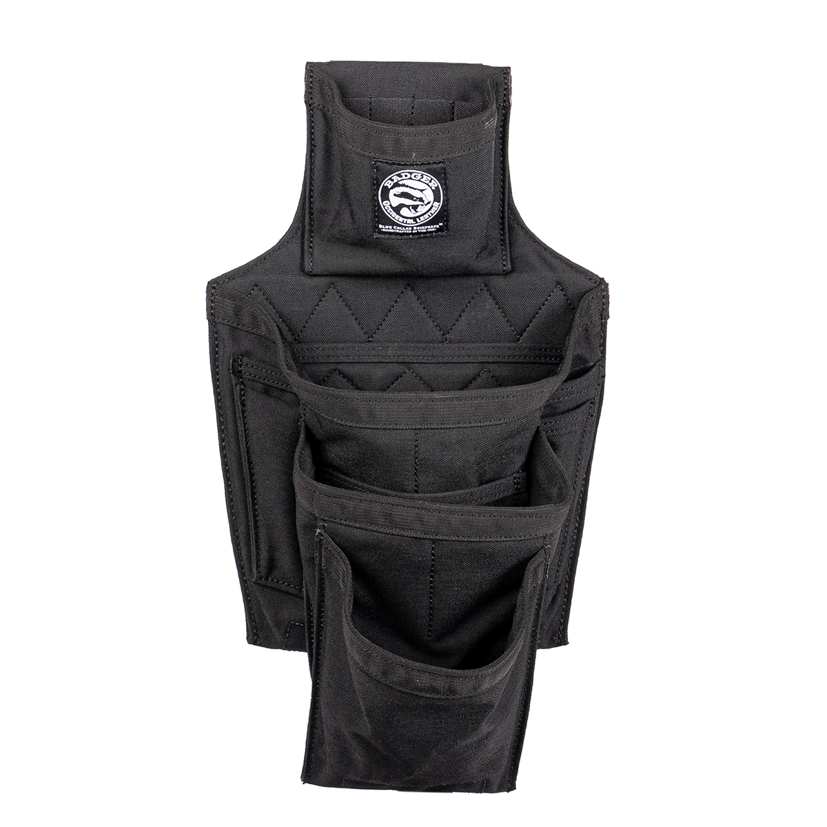 Framer Fastener Bag: Tape pouch with 4 interior 1″ wide elastic slots, speed square slot in main pouch with wide tool slot below, fastener pouch with slot, lower fastener pouch, two front tool pockets, 2 stacked rear tool slots and a reinforced bar sleeve on the underside of the bag. Overall length is approximately 17″.